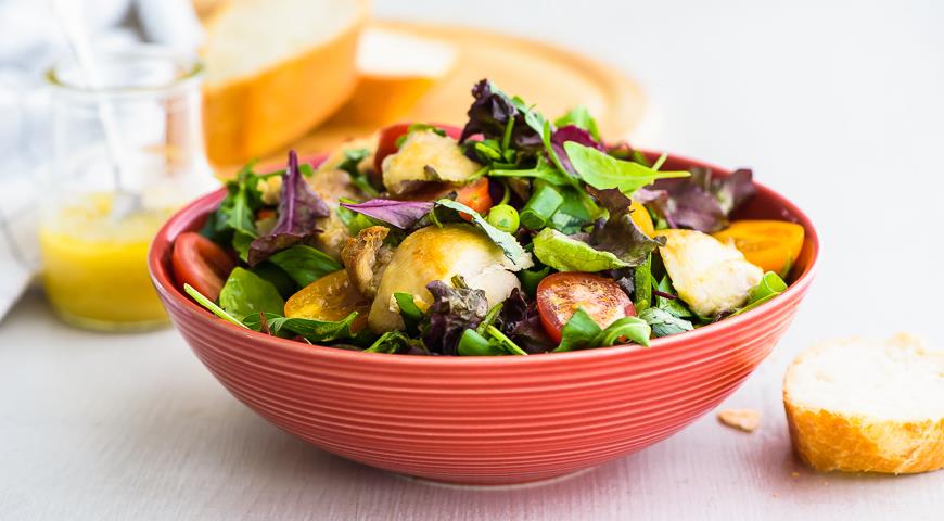 - Mélangez la salade avec les herbes et la vinaigrette (1 c. À soupe), mettre sur une assiette. Mettez des morceaux de poulet sur les feuilles et Des tomates Arrosez le reste de la vinaigrette et servez.