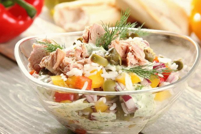 Salade très savoureuse et inhabituelle, ce qui est parfait pour dîner de famille ou table de fête. La recette indique thon en conserve, mais si vous le souhaitez, il peut être cuit à la maison et avec frit.