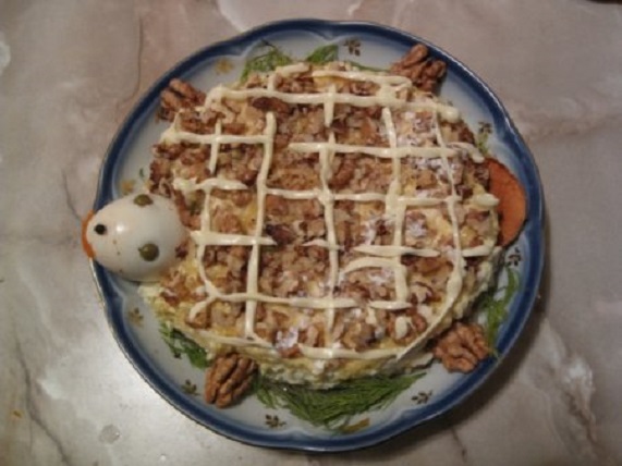 Voici une recette de salade non seulement savoureuse et saine, mais aussi très magnifique Les enfants seront ravis de voir une telle “tortue”! Essayez de cuisiner à la maison.