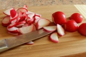 Pelez le radis. Couper les cercles en deux et mélanger avec l’œuf.