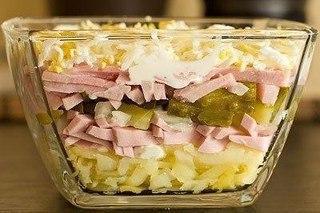Mettez le jambon, une couche de concombres et le jambon à nouveau sur les pommes de terre.