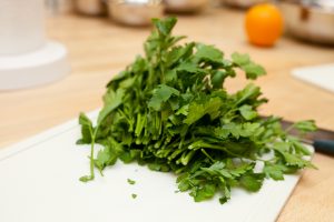 - Au basilic, à la menthe, au persil et à la coriandre, nous enlevons les tiges et les haché.
