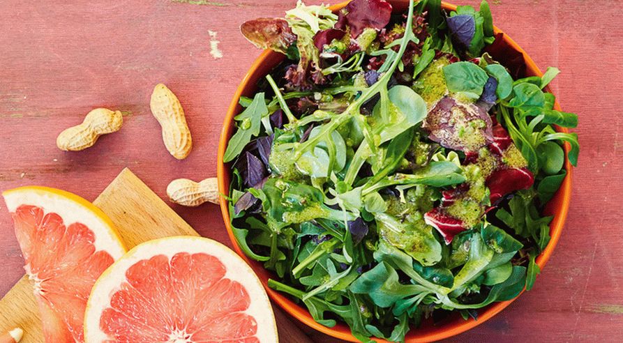 - Mélanger le jus de pamplemousse, la moutarde de Dijon, le miel liquide, le sel, poivre et huile d’olive.