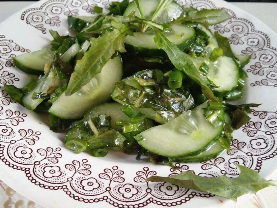 - Nous sortons les feuilles de pissenlit de la solution, les lavons, les assèchons et haché. Ajouter aux concombres, aux oignons et aux orties.