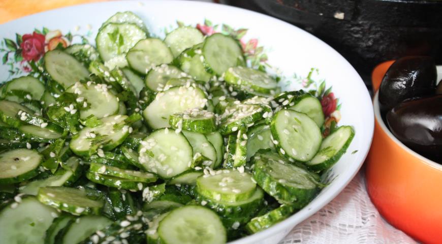 Une délicieuse salade épicée aux graines de concombre, citron vert et sésame Vous pouvez cuisiner rapidement et facilement à la maison, je vous conseille de faire un complément à la pomme de terre. Vous pouvez également manger pour une collation. Idéal pour une telle salade petits concombres croquants feront l’affaire.