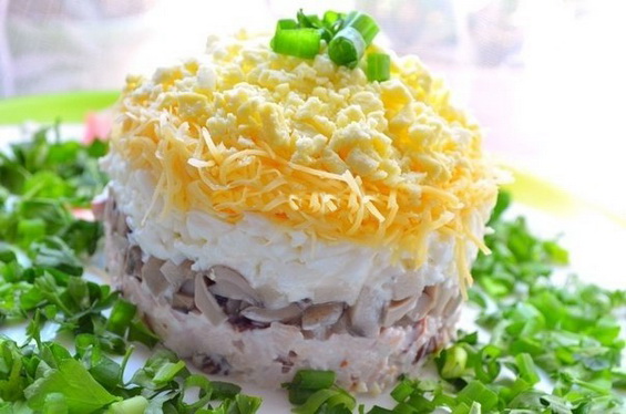 - En tant que vrais architectes, nous créons notre salade en couches de bas en haut: d’abord la viande, puis les champignons, les protéines, la mayonnaise, le fromage, mayonnaise, les jaunes et décorer avec les verts (par exemple vert haché oignons).