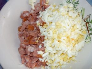 - Hacher finement les œufs et les saucisses, mélanger avec de la mayonnaise ou yaourt
