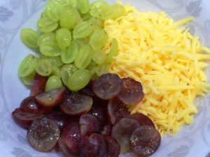- Mettez de gros raisins sur le dessus. Coupez-les en deux ou sur quarts. Si les raisins secs, alors laissez les baies entières, qui seront “fondre dans la bouche”, rafraîchissant agréablement et donnant à la salade un goût raffiné. Vous pouvez utiliser des raisins verts et bleus pour donner une apparence de salade festivement.
