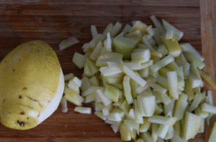 - Lavez les poires, retirez le noyau, hachez avec des pailles.