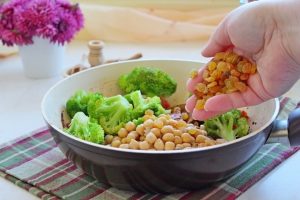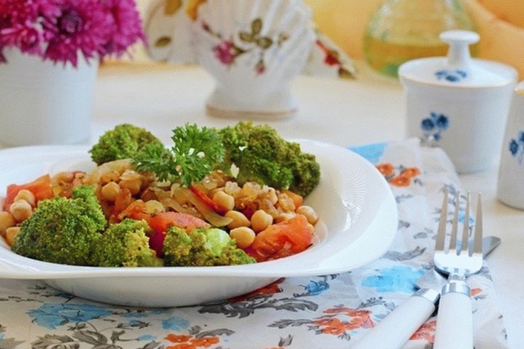 Si vous suivez votre silhouette et mangez bien, alors essayez de cuisiner chez vous une délicieuse salade tiède avec brocolis, pois chiches et raisins secs selon cette recette. Je vous conseille de faire un plat avec pois chiches pré-trempés et bouillis.