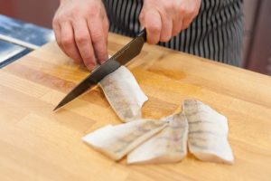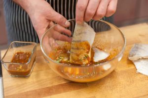La sauce est divisée en deux parties. On sera comme la sauce de poisson, et le second est comme une marinade. Dans cette marinade, vous devez bien rouler le poisson et laissez-le pendant 10-15 minutes.