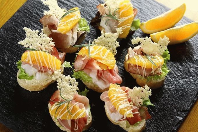 Mettez les feuilles de laitue sur une baguette avec de l’huile, ajoutez dessus lamelles de jambon Divisez l’orange en tranches, bien dégagées épluchez, envoyez au jambon de Parme et versez avec la mayonnaise en utilisant un sac en plastique, dans le coin duquel nous faisons un petit couper.