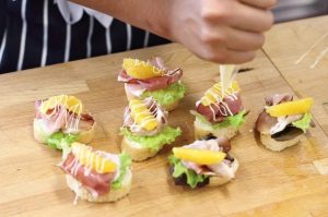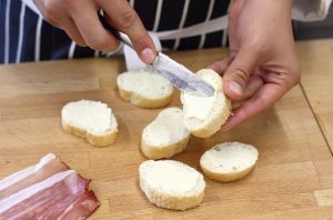 Couper la baguette en fines tranches et les graisser à l’huile. Parme couper le jambon en petits morceaux.