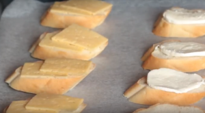 - Mettre le fromage sur des morceaux de baguette et le faire fondre légèrement un four ou micro-ondes.