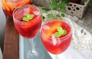 - Mettre la glace dans des verres, verser la sangria et décorer avec des feuilles menthe poivrée.