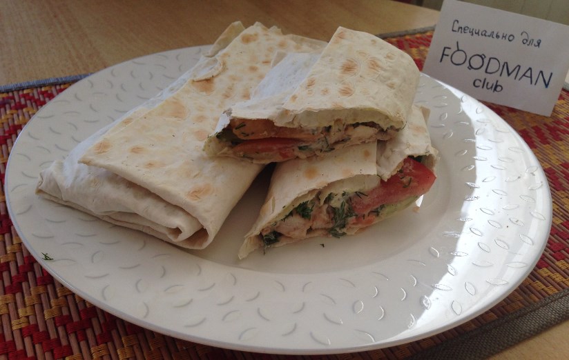 - Nous recueillons le shawarma, graissons d’abord le pita avec du fromage cottage, puis mettre du poulet et des légumes. Assaisonner avec du paprika, du poivre noir et ail séché. Tournez le shawarma.
