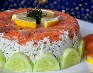 Un très beau et délicieux gâteau de collation peut être préparé à la maison de saumon salé, concombre frais, aneth, oignons, gélatine et la crème sure. Ce sera la décoration de la table de fête.