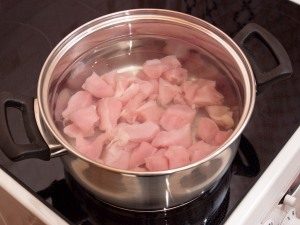 - Laver le poulet, couper en cubes, verser de l’eau froide (deux litres d’eau), mettre le feu, porter à ébullition, retirer la mousse avec une cuillère à égoutter, cuire encore à feu moyen jusqu’à complète prêt pour environ 15 minutes.
