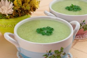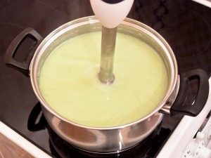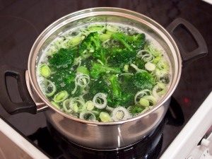 - Ensuite, ajoutez l’oignon haché au bouillon de poulet. Suivant ajouter le brocoli, saler légèrement, poivrer et tout cuire dix minutes.