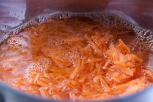 - Frotter les carottes, ajouter à l’oignon avec de l’ail, verser de l’eau Porter à ébullition et cuire environ 20-25 minutes sous le couvercle. Les légumes doivent être mous.