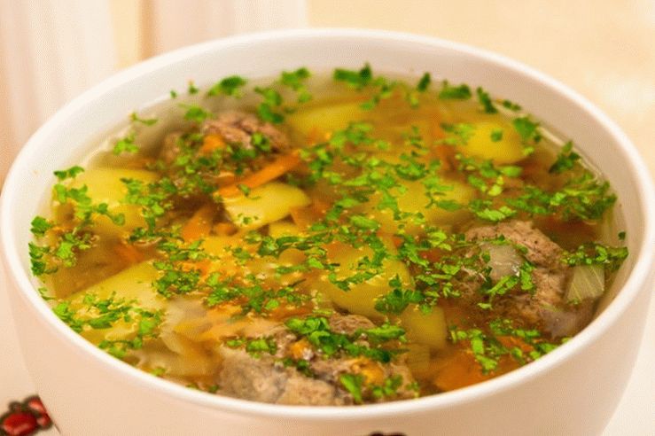 - Dans la soupe presque prête, ajoutez une feuille de laurier, retirez du feu cinq minutes. Donne un peu de sueur. Soupe prête servie avec herbes hachées.