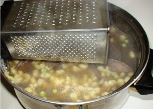 - Nous mettons une râpe avec les plus grands trous sur le bord de la casserole. Nous étendons une partie de la pâte et la pressons dans une râpe avec une cuillère. La pate S’égoutter dans la soupe devient instantanément de petites quenelles. Étalez les petits pois surgelés. Cuire 10 minutes.
