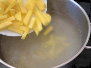 - Couper les pommes de terre en cubes et les baisser dans de l’eau bouillante. Faire cuire environ 15 minutes.