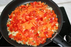 - Faire fondre le beurre. Faire frire l’oignon jusqu’à ce qu’il soit transparent. puis mettez les carottes, faites frire jusqu’à tendreté. Puis verser faire frire le poivron rouge pendant 4-7 minutes.
