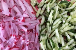 - Les concombres aux radis déchiquettent les pailles ou la grille Carottes coréennes.