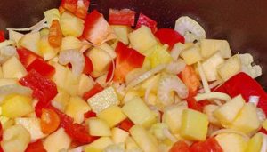 - Après 5 minutes, versez les courgettes, les poivrons, les poireaux et pétiole de céleri. Remuer, cuire 5 minutes.