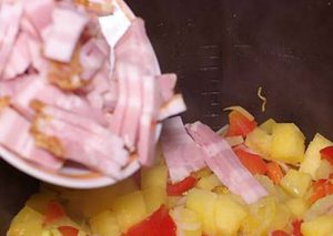 - Côtelette de poireaux et céleri. Pommes de terre en dés, poitrine – avec des rayures étroites.