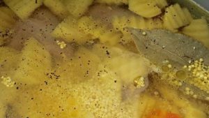 - Verser le mil lavé à l’eau chaude. Mettez du poivre, du sel, ajoutez une feuille de laurier. Et remplissez-le avec 3 litres d’eau.