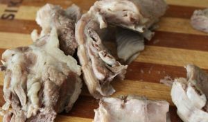 - Nous sortons la viande du bouillon, séparons les os, coupons et revenir avec des pommes de terre hachées.