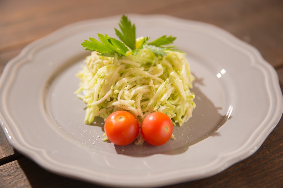 - Nous assaisonnons nos “spaghettis” de sauce aux courgettes et aux noix servir sur la table. La salade est incroyablement légère et délicieuse, mais pas encore va faire mal à votre silhouette!
