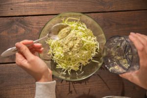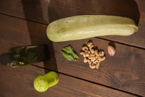 - Dans un mixeur, étalez le basilic, les noix de cajou (leur besoin de tremper), l’ail, l’huile, le sel et le jus d’un demi citron.